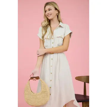 This collared button down belted midi dress has short fold sleeves, pockets with tab, belt loop with belt in 100% polyester.