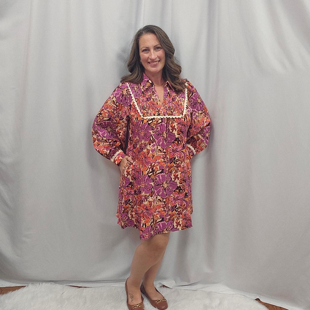 Long sleeves floral dress with side pockets, smocked chest, ric rac trim detail.