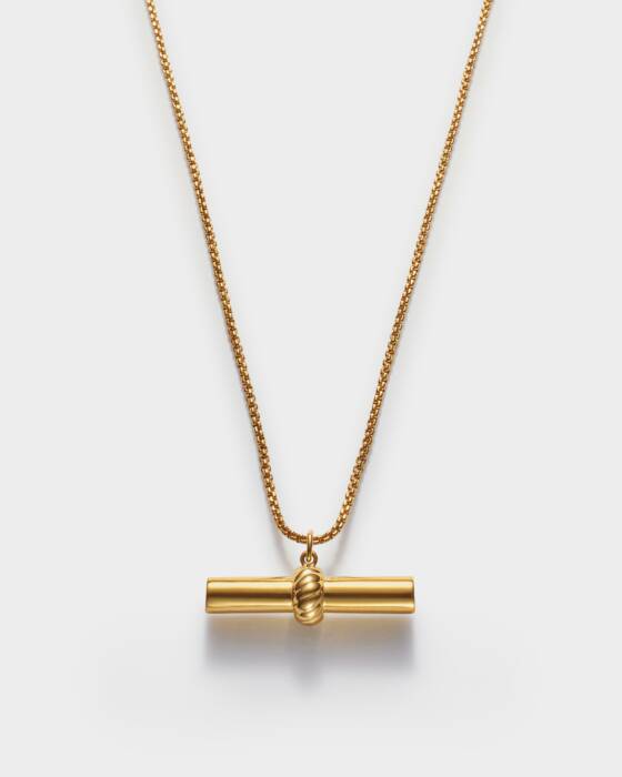 Our Themis T-Bar Necklace is made from durable 18K Gold PVD coating, making it certified waterproof, sweat-proof, and life-proof. Featuring a sleek T-bar pendant design that is utterly timeless, it stands out solo or pairs beautifully with the matching bracelet, earrings, and ring. Presented in a reusable suedette pouch, it's ideal for gifting or taking with you on the go.
